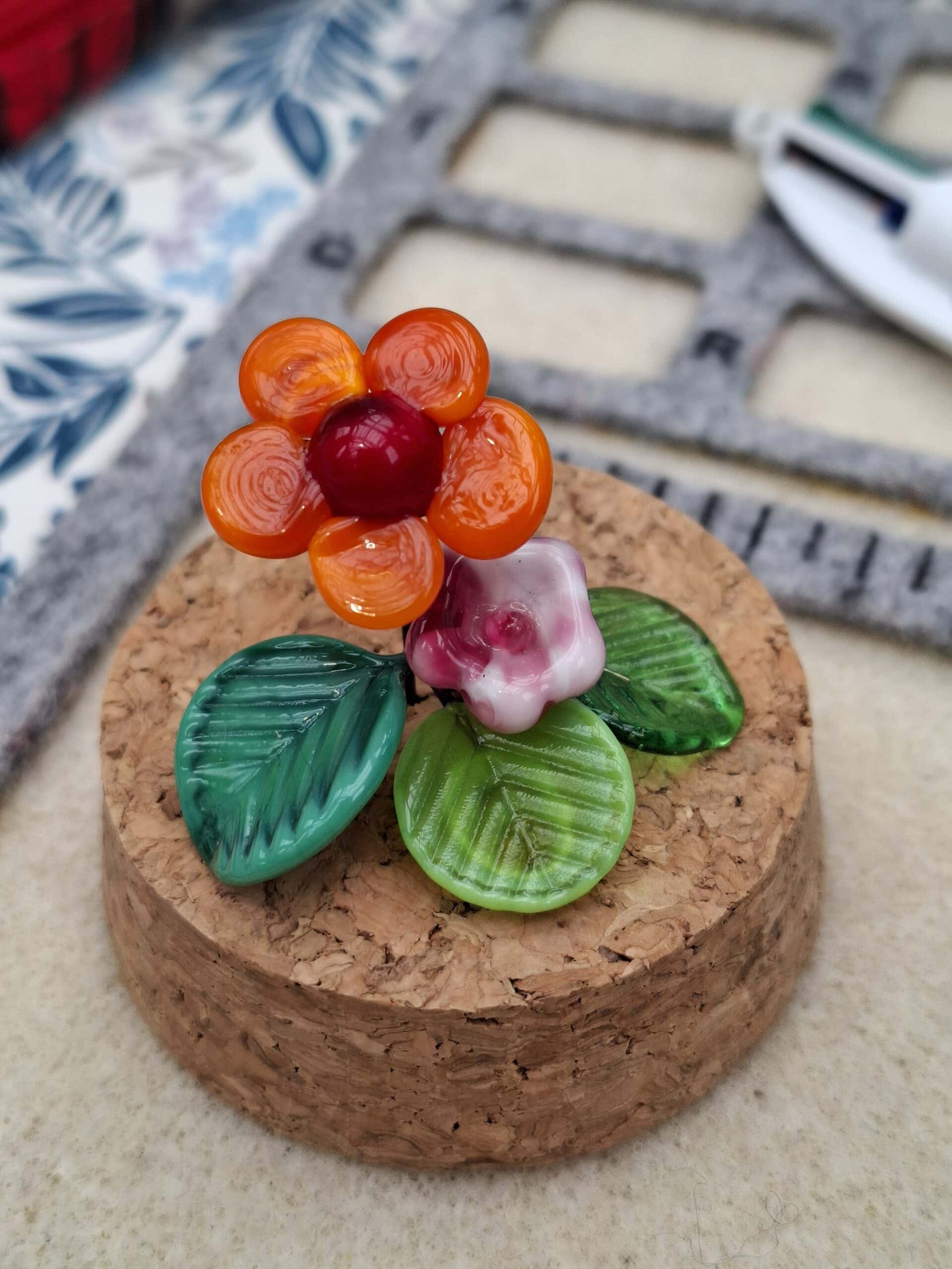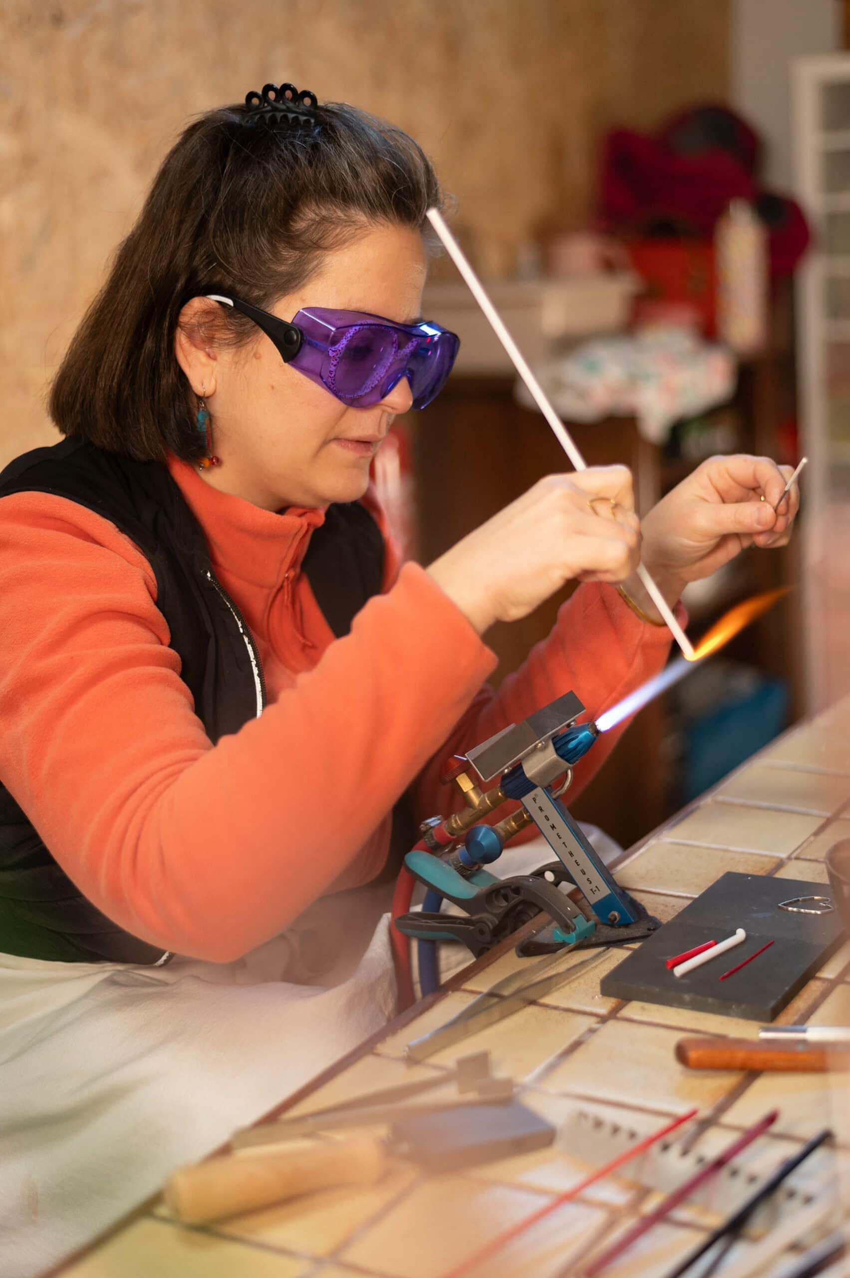 Son parcours prend racine dans le monde de la petite enfance, où elle a exercé pendant plus de quinze ans. En parallèle, elle a toujours cultivé un goût profond pour la création, aimant expérimenter et travailler de ses mains. Il y a plus de quinze ans déjà, elle réalisait ses premiers bijoux, nourrissant le rêve de fabriquer un jour ses propres perles en verre. Cette envie l’a conduite à suivre un stage de soufflage de verre il y a presque dix ans, une expérience déterminante qui a ancré durablement sa fascination pour cette matière.
